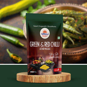 Vruj Masale Mirchi Aachar or chilli pickle masala is blend of spices with a recipe that have been handed down over generations that provides home-made taste in every bite. Pre-mix Hari Mirch Achar Masala, Ready-to-use Homemade Stuffed Green Chilli Pickle with lots of masala from Vruj. Every Spice In The Pickle Is Handpicked, Carefully Selected And Of Best-Quality Making Them Last Longer And Keep You Healthy. The Spiced Tangy Mix Of Condiments Brings Out The Special Feel Of Nostalgia With Perfect Taste And Aroma. It Can Be Paired With Parathas, Dal Rice, Puris, Khichdi, Khakras, Idli'S And Just About Anything And Everything We Can Pair It With.