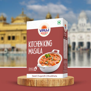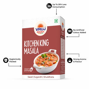 This spice blend is widely used in Indian cuisine, especially in curries, gravies, and stir-fries. It helps to enhance the taste and colour of the dishes, giving them a unique and appetizing flavour. Vruj Kitchen King Masala can be used to season vegetables, lentils, rice, biryanis, and even snacks like samosas and pakoras. Overall, Kitchen King Masala is a must-have spice blend in a kitchen, as it adds depth, complexity, and a burst of flavours to a wide range of dishes