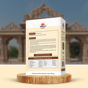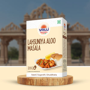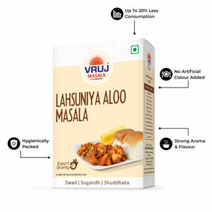 Step 1 : Boil 1 kg potato and cut it into pieces. In a bowl add whole packet of Vruj Lahsuniya Aloo Masala in water and make a thick paste. Now add 8 spoons (150 ml) oil in a pan, add Vruj Lahsuniya Aloo Masala paste and stir. Add boiled potatoes and cook well for 2-3 minutes. Serve Vruj Lahsuniya Aloo with pav and masala peanuts.
